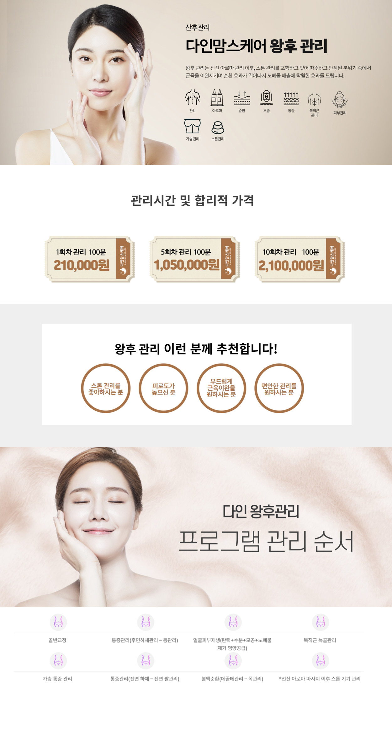 부종, 체중, 노폐물, 혈액순환, 튼살, 변비, 통증이완(어깨, 등, 허리, 골반), 발, 골반 교정, 복직근 교정, 늑골 관리